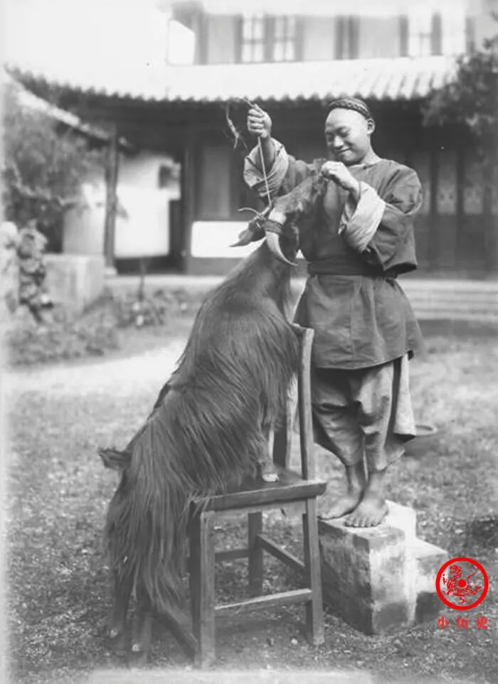 这张照片画面生动和谐,男子似乎是在训练山羊,用于马戏表演。现在还有这种长毛山羊吗?