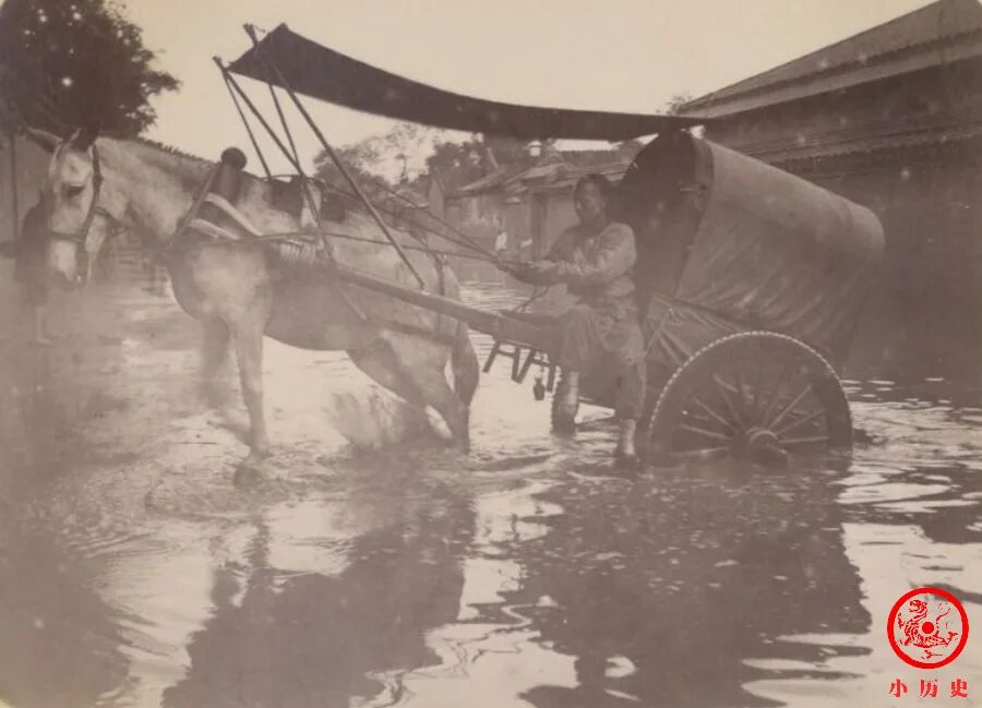 1893年,在北京街道积水中艰难行走的马车。照片来自穆意索《北京相册》。