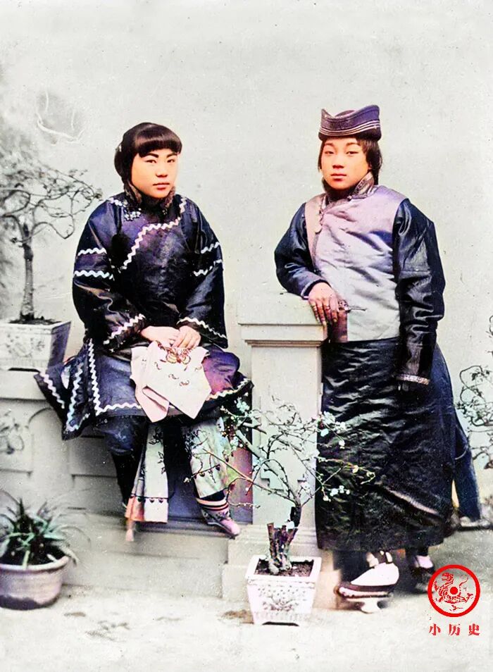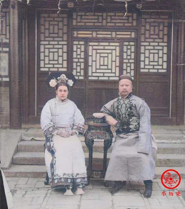 这对夫妇来自不同的国家,丈夫是八旗子弟,妻子是洋人。当妻子穿上旗装时,并没有让人感到不协调。她的面孔有一种东方韵味,很可能从小就生活在中国,对中国的文化和习俗非常熟悉。