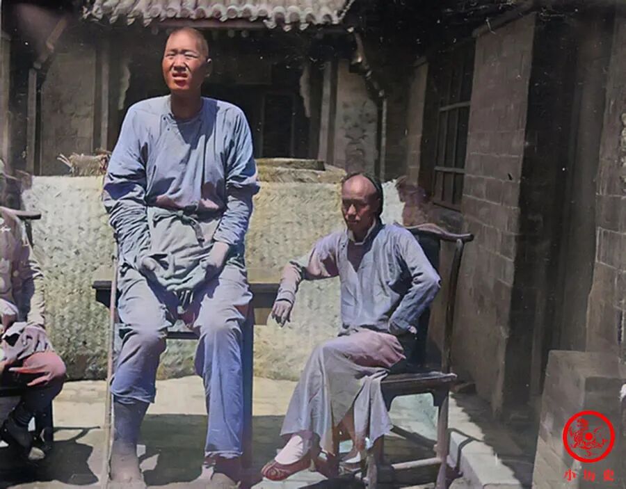 这位巨人身材十分庞大,目测比右侧身高正常的男子高出三分之一。请大家注意,他右侧放置了一根拐杖。由于身高异常,他行走时需依靠拐杖来保持平衡。
