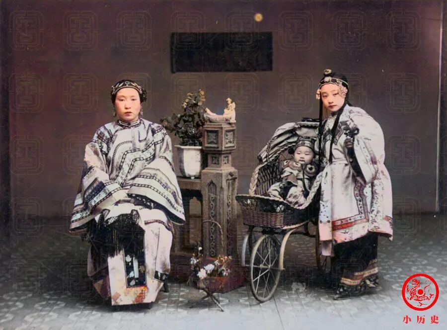 这位母亲穿着漂亮的衣服,带着两个孩子到照相馆拍照。她的幼子尚在襁褓中,躺在婴儿车里。那时候的婴儿车有三个高大的轮子,显得笨重,但它的设计细节很突出,配备了能够轻松拉开和收起的遮阳篷。她的女儿小小年纪,已经缠足,令人痛心。