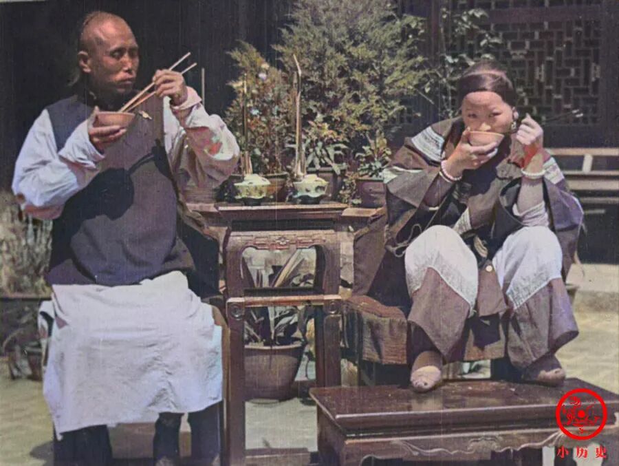 一对夫妻正在吃饭,各自手里捧着一碗饭,桌上仅有一杯茶,可谓简陋。就周围环境而言,他们家的经济条件非常优越,因此说这个场景是为了拍照而专门设下的。他们俩都害羞地躲避着镜头,丈夫转过了脸,而妻子则几乎把头埋进饭碗里。尽管如此,她还是抬起眼睛偷看了一眼。在照相机刚刚开始普及的那个年代,一般人对摄影没有认识,难免产生惧怕情绪,甚至把它视为“摄魂机”。