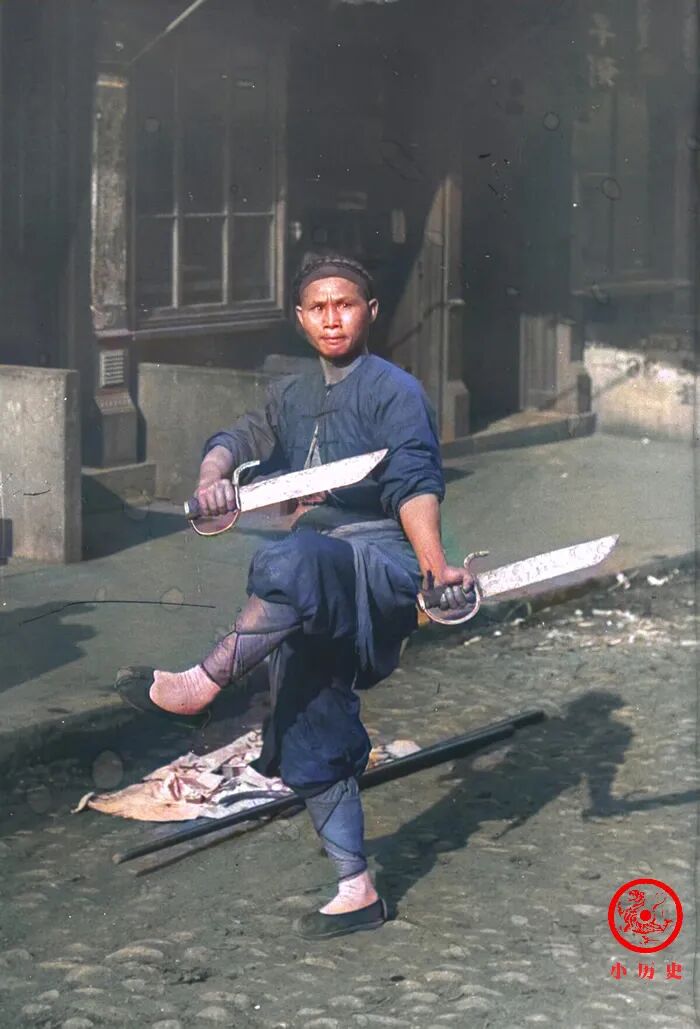这位男子单腿站立,双手分别持刀,眼神锐利有力。你是否能认出他正在表演哪一套传统武术?在旧时代,许多人学习武术的目的往往有两个方面:其一是为了保持健康;其二则是为了保护家园安全。那个年代经常会有土匪山贼侵入村镇抢劫,学习一些武术可以增强自身防御能力,驱逐那些亡命之徒。