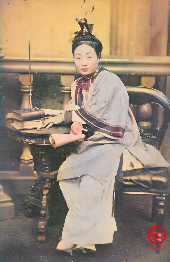 一位年轻女子手中拿着书,在一家装饰考究的照相馆中拍照。摄影师称她为“涂脂抹粉的女士”,隔着百余年的历史时光,我们仍然可以看到她身上散发着光彩照人的气质。
