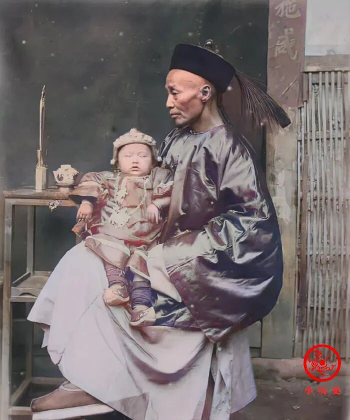 这位父亲是朝廷命官,正在照看熟睡的孩子。在现今保存下来的众多晚清老照片中,记录父亲看孩子的画面非常少见。或许因为当时的父亲普遍“主外”,很少直接参与孩子的养育工作,这项工作几乎由“主内”的母亲一人承担。