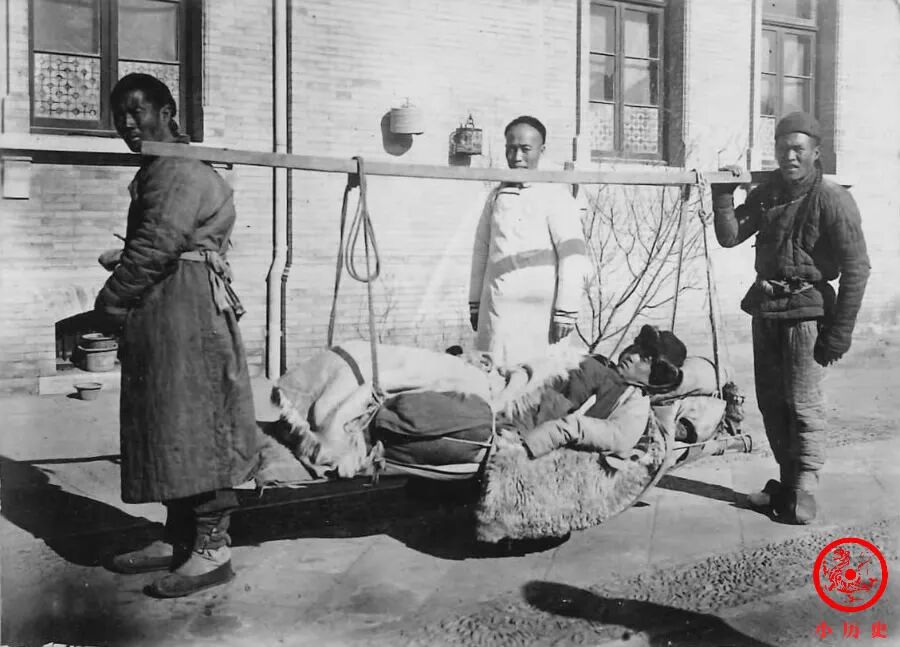 这名病人被抬到北京协和医院治疗。摄影师称这个简陋的担架为Chinese ambulance(中国救护车),实在有点夸张了,它没有轮子,连车都算不上呢。