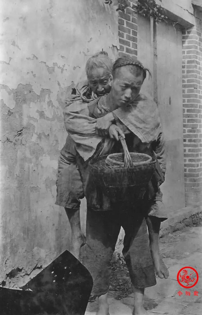 若不是失去家园或者家庭破产,沦落到走投无路的地步,这名男子怎么可能背着年迈的老母亲四处流浪,以乞讨为生?老母亲连一双鞋子都没有,可见贫困到了极点。晚清时期社会动荡,因天灾、因战乱而流离失所的百姓并不少见。