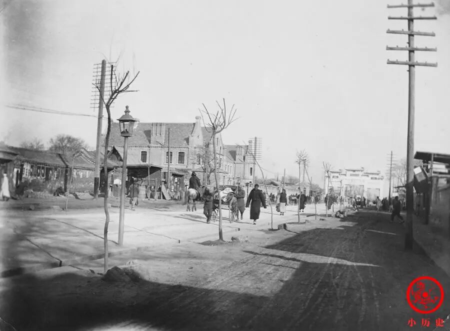 这段街道今称东单北大街。大街两边竖立着电线杆和路灯,可以看到新时代的迹象。路左的西式建筑是协和医院,不远处的四柱三间牌楼为克林德碑。