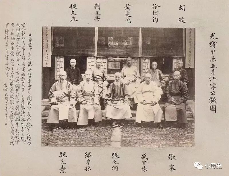 这张名为“光绪甲辰五月江宁公宴图”的照片,光绪三十年(1904年)四月初一(据《张謇日记》记载,题字所说“五月”有误)拍摄于南京江安粮道署。