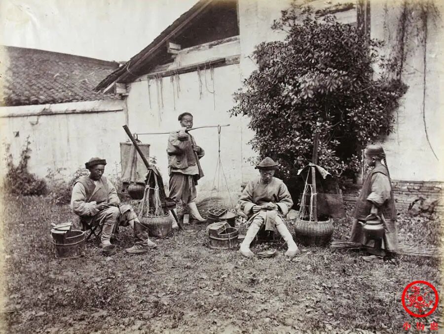修鞋是一个传承数千年的行当,鞋匠以流动揽活为主。他肩扛扁担,一头挑木箱,一头挑竹篮,木箱里装着皮子、胶水、钉子等物品,竹篮里装着铁拐顶和小砧子之类的工具。鞋匠出来干活,一般不吆喝,拿一个拨浪鼓,“咕咚咕咚”一摇,招揽生意。