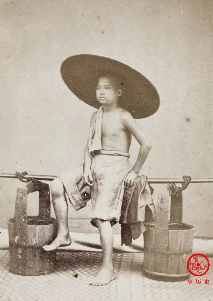 这张照片可能是摆拍,虽然少年把自己打扮成劳动者模样,但他身板单薄,根本挑不动两桶水。