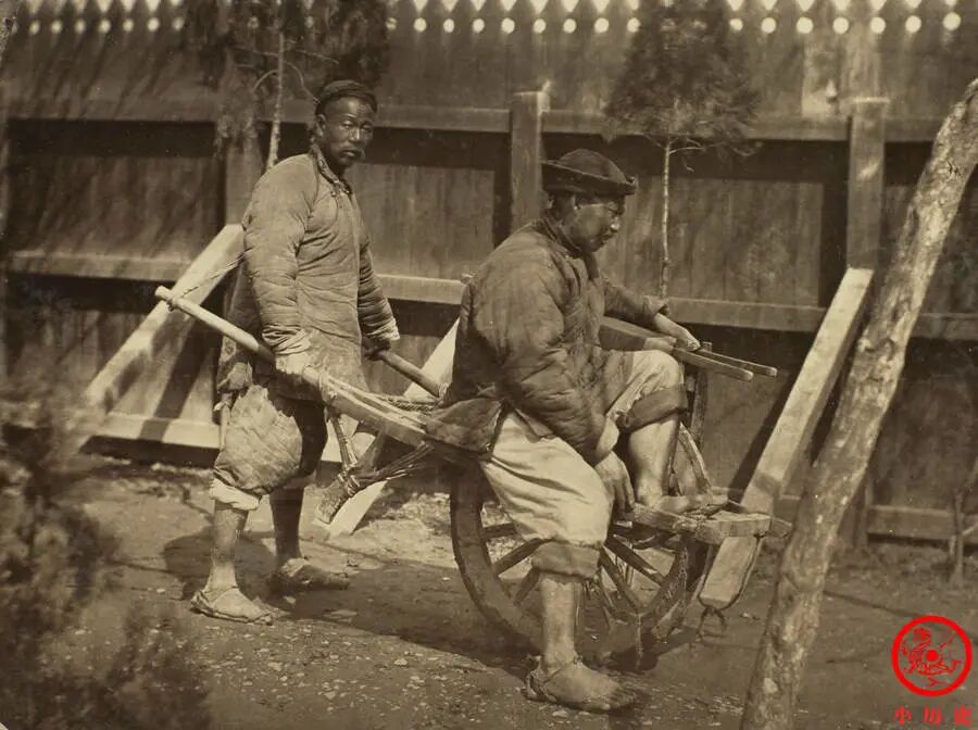 照片中记录了两位底层劳动者的形象,他们是使用独轮车搬运货物的打工人。时值冬天,两个人都穿着草鞋,可见生活多么艰苦。