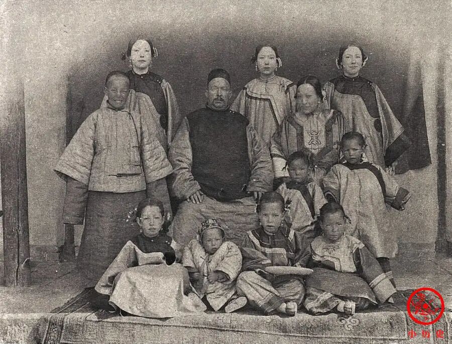坐着的一男一女就是上一张照片里“万民伞”下的夫妻,两人带着一群大大小小的孩子合影,应该是儿女辈和孙辈。