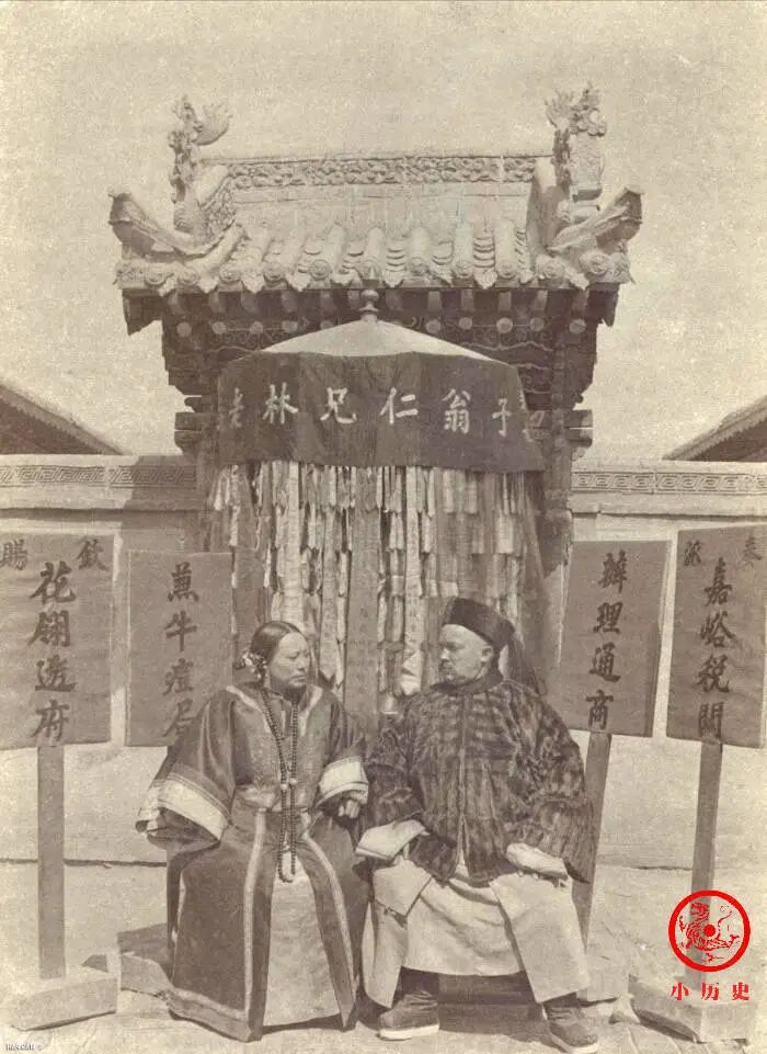 官员做了实事、声誉良好,当地百姓就会送“万民伞”表示感谢。从他们身后的牌子上可以看出,这名官员在甘肃任职,政务、军事一把抓,既管通商、收税、公共卫生,也领兵打仗(花翎游府即游击将军,正三品武官)。他的妻子已被封为诰命夫人,所以也穿了补服、戴了朝珠。