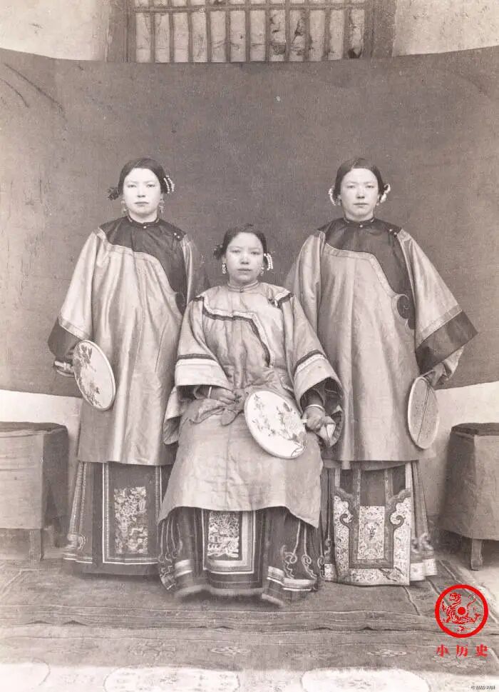 从长相上看,三个人很明显是亲生姐妹,如同一个模子里刻出来的,而且都穿袄裙、都拿团扇,头饰也相似,说是三胞胎一点儿不违和。她们来自前一张照片中的官宦家庭,是那对夫妻的女儿。