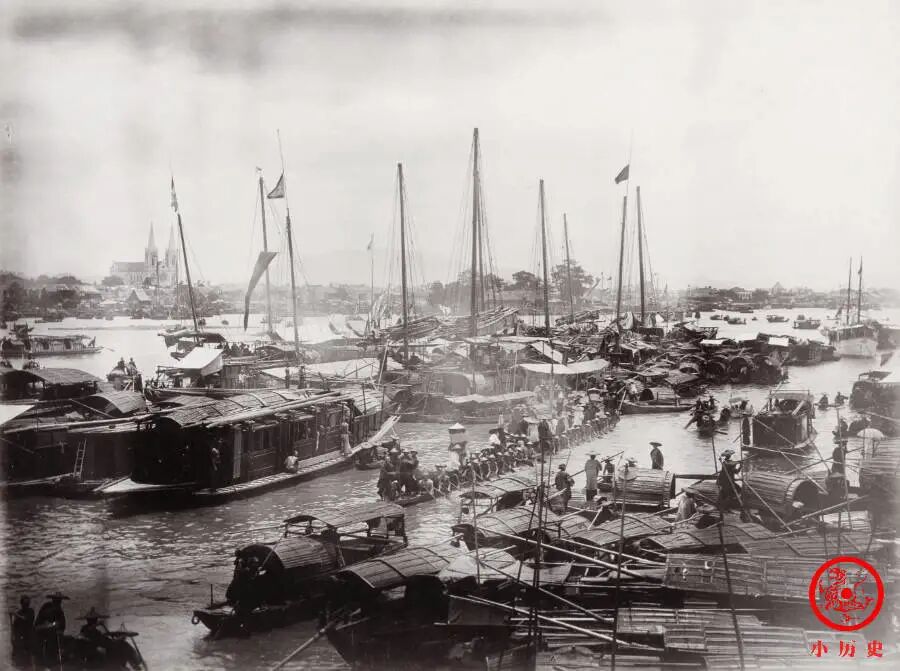 这张照片捕捉到端午节的重头戏——龙舟出游的热闹场面,实属难得。自唐宋以来,常有关于龙舟赛的绘画作品问世,到了晚清,摄影师黎芳则用当时新兴的摄影术来记录这一重要文化节庆。
