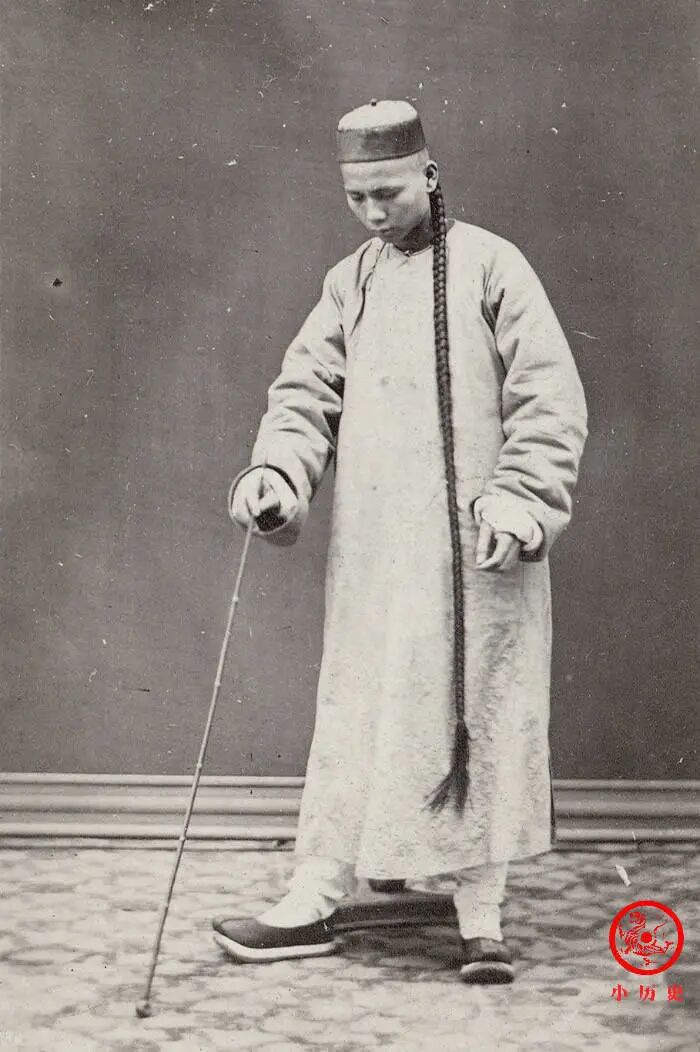 一名男子穿着长衫,因视力不佳,手持木棍,试探着前行。当然,这一幕是在照相馆内摆拍的。他的大辫子又粗又长,长度达到膝盖以下,特别引人注目。根据相关记载,这么长的辫子打理起来非常费劲,一般情况下十天半月才梳洗一次,所以常常散发出难闻的味道。
