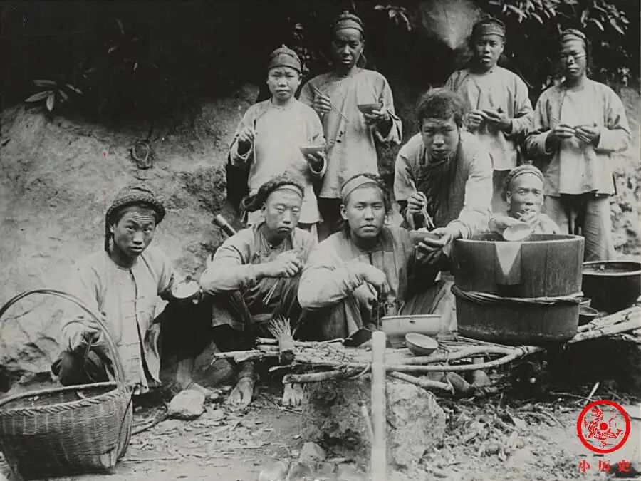 经过一上午的忙碌,9位农民终于吃上了饭。当摄影师摁下快门的那一刻,他们同时停下来,一致地看着镜头,毫无疑问是第一次与照相机打照面。看得出来,他们的餐食非常简单,可能只有粗糙的米饭和寡淡的菜汤。
