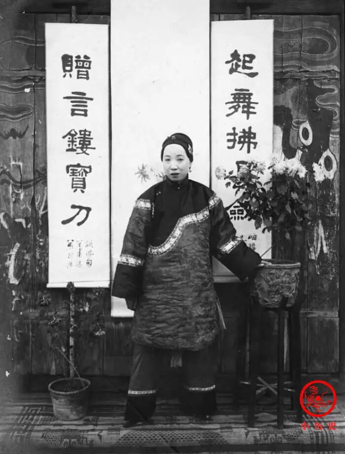 这名妇女裹着小脚,颤颤巍巍,在中式屏风前留下倩影。她身后挂着一副对联:“起舞拂长剑,赠言镂宝刀。”这两句是李白两首诗歌的集句,充满了尚武的精神。一名柔弱的女子站在这副对联前留影,不知是何意味?