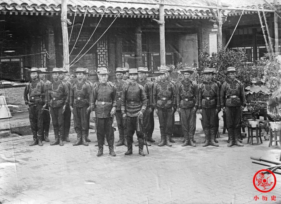 这支卫队共有官兵20余人,胸前写着“肃毅卫队”四字。看他们的着装,很可能隶属于武卫军(甲午战后编练的拱卫京畿的部队)。1864年太平天国覆灭后,李鸿章因军功卓著被朝廷封为一等肃毅伯,因此他的贴身护卫被称为“肃毅卫队”。这些人的军容风貌还算不错。