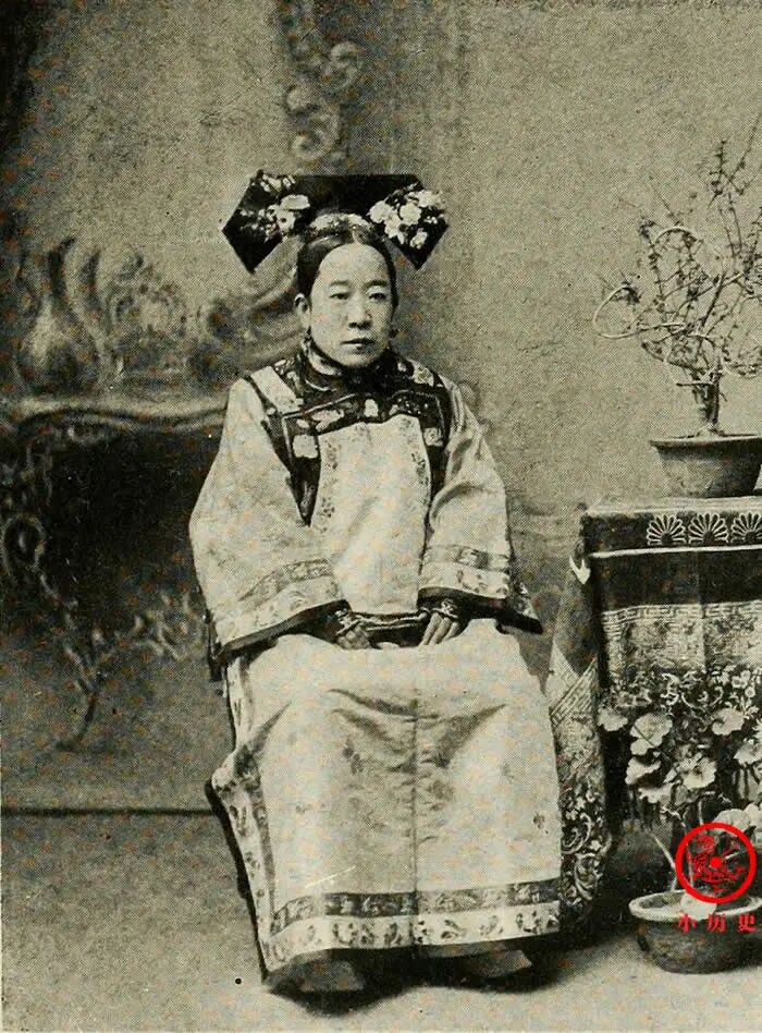 此人衣着讲究,显然出身于八旗贵族阶层。她脚上穿的花盆底鞋,正是贵妇的标志之一,行走不疾不徐,凸显婀娜身段。不过这位贵妇略显男相,形象霸气,可能不太“婀娜”。