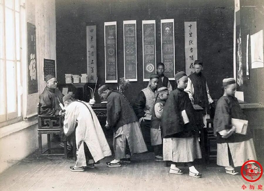 往头上喷洒药水清除虱子、私塾放学学生作揖告别老师、妇女端坐形象霸气……10张老照片,认识晚清社会历史。