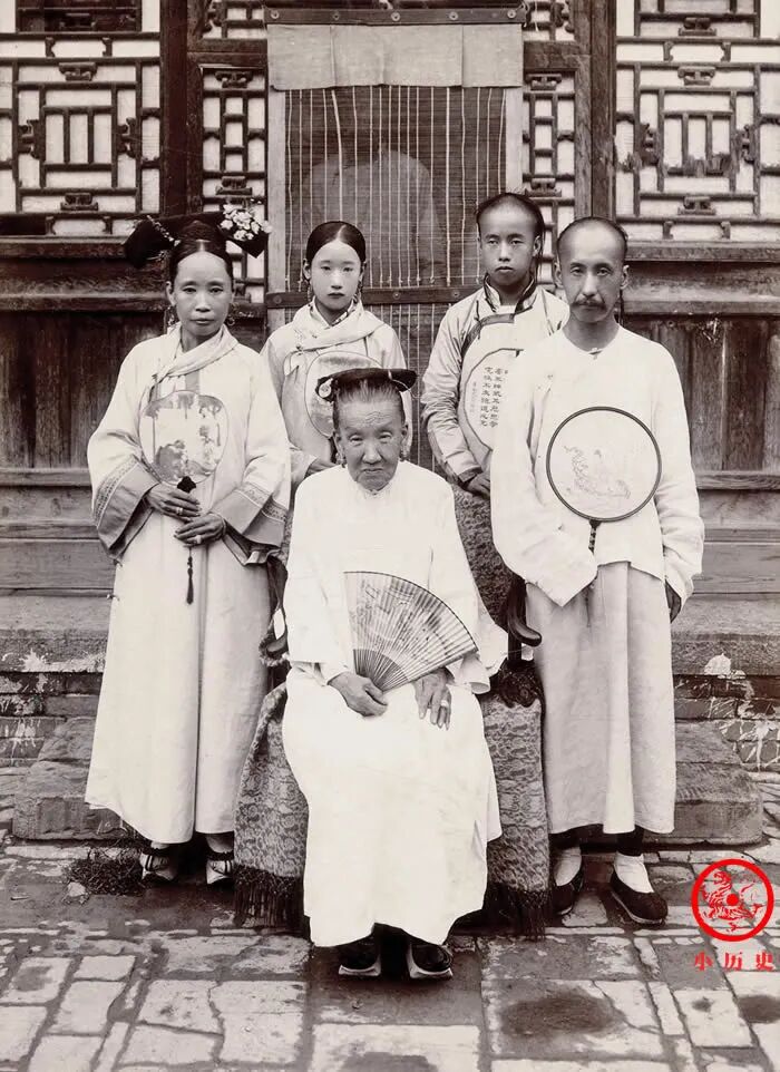 老中青三代人都入镜了,他们的发型和服饰都很日常,为研究晚清旗人生活提供了参考。竹帘后面隐约可见人影,可能是羞于面对镜头的家人。那个年代,拍照很奢侈,但是也有很多人难以接受,“摄魂”的传说仍然在民间流传。