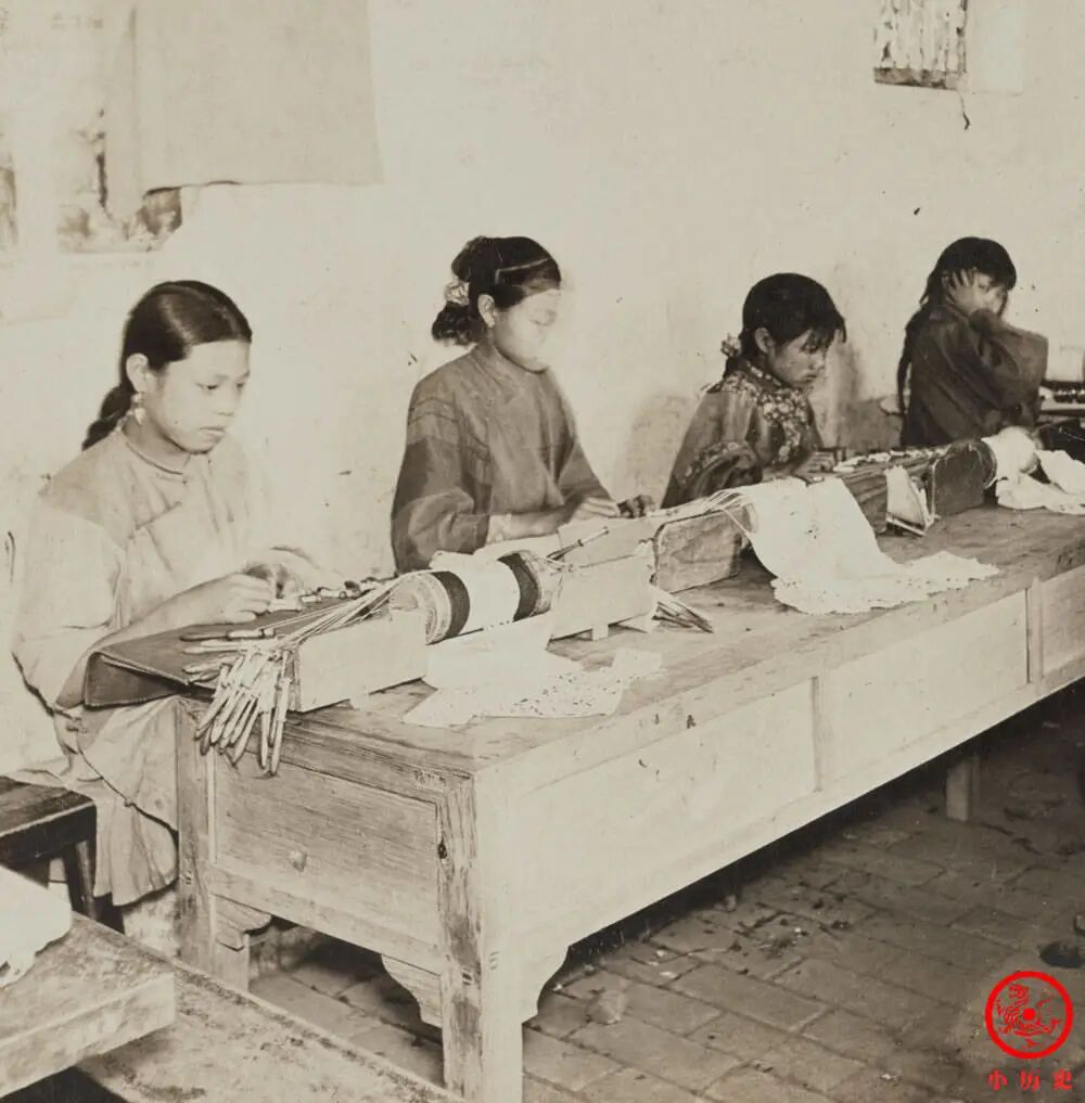 这张照片记录了烟台一所技能培训学校的教学场景。几千年来,年轻人学技能,都是以师带徒,作坊里的师傅在实践中教学生,没有专门的技校。到了晚清,随着经济社会的发展,对技能人才的需求日益高涨,各地开设了许多专门技校(男女分校),改变了传统的技能传授方式。