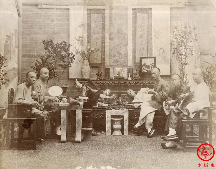 照片中七名男子神情自若,抽烟(有两人抽鸦片)、喝茶、聊天。室内家具摆设极为考究,就算是摆拍,也花了不少心思去装饰。墙上悬挂着郑板桥的名联:“春风放胆来梳柳,夜雨瞒人去润花。”