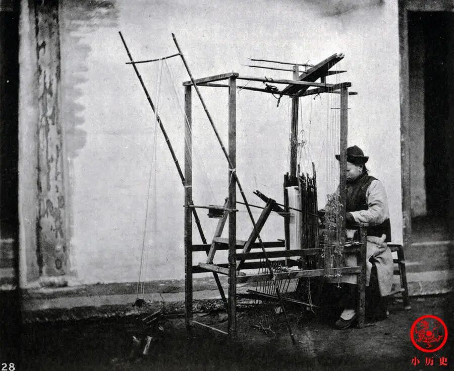 这种简陋的织布机是农业社会家庭手工业常用的设备,有着悠久的历史。晚清时期在大机器生产的冲击下,其日益显示出低效的一面。