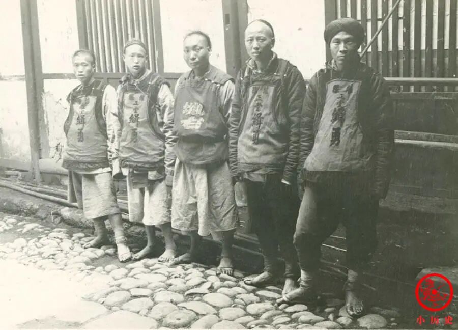 这张照片拍摄于1909年,人物胸前写着“灌县正堂缉勇”几个字,标注了他们的身份。缉勇即捕快,负责侦破案件、缉拿案犯。他们每年的“工食银”不过十两白银左右,很难养家糊口,于是敲诈勒索便成为一种风气,他们时常设置种种名目收取好处费。
