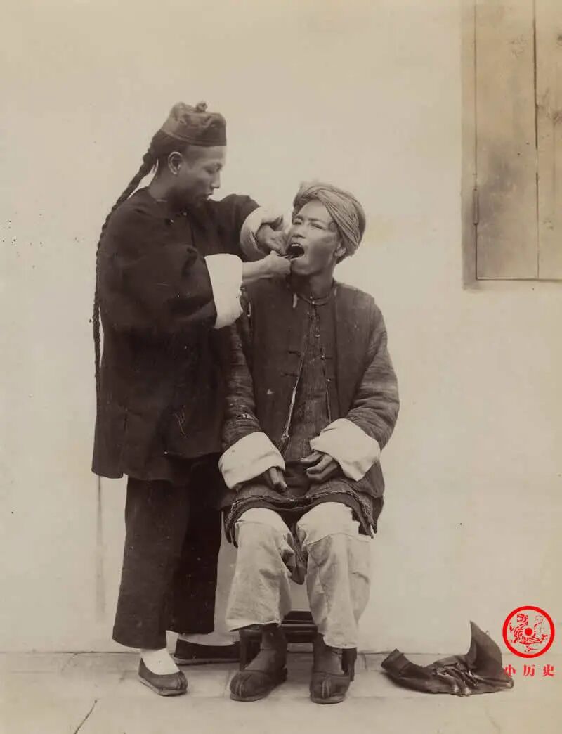 这张照片记录的场景让人感到很意外,拔牙是对卫生条件要求非常高的技术活,大夫怎么在这么简陋、粗放的环境下就干了?工具放在地上,没有消毒措施,真是让患者承担了很大的风险。另外,患者如何忍受拔牙的疼痛呢?