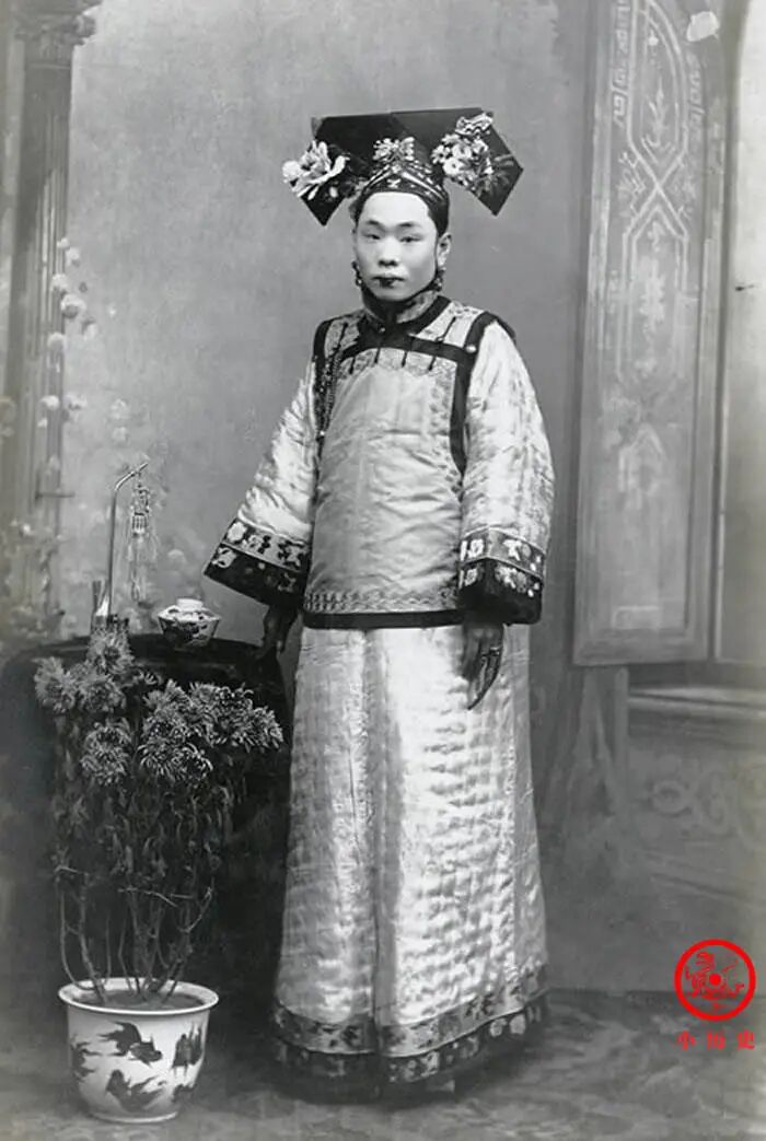 这位妇女头戴大拉翅,穿坎肩和氅衣,一副典型的晚清旗装风格。她手上戴着护指,特别讲究指甲的保养,说明她来自富贵之家,自己不用干家务活。