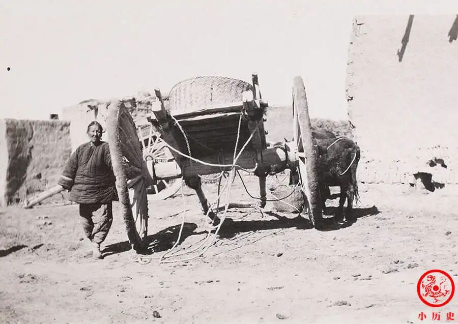 英国记者莫理循拍下的这种大轮牛车,在商代考古中已有发现,其历史超过3000年,至清末仍是西北地区主要的交通工具。古老的牛车,沿着深陷的辙沟喘息前行,发出吱扭吱扭的鸣响,诉说着生活的艰辛。