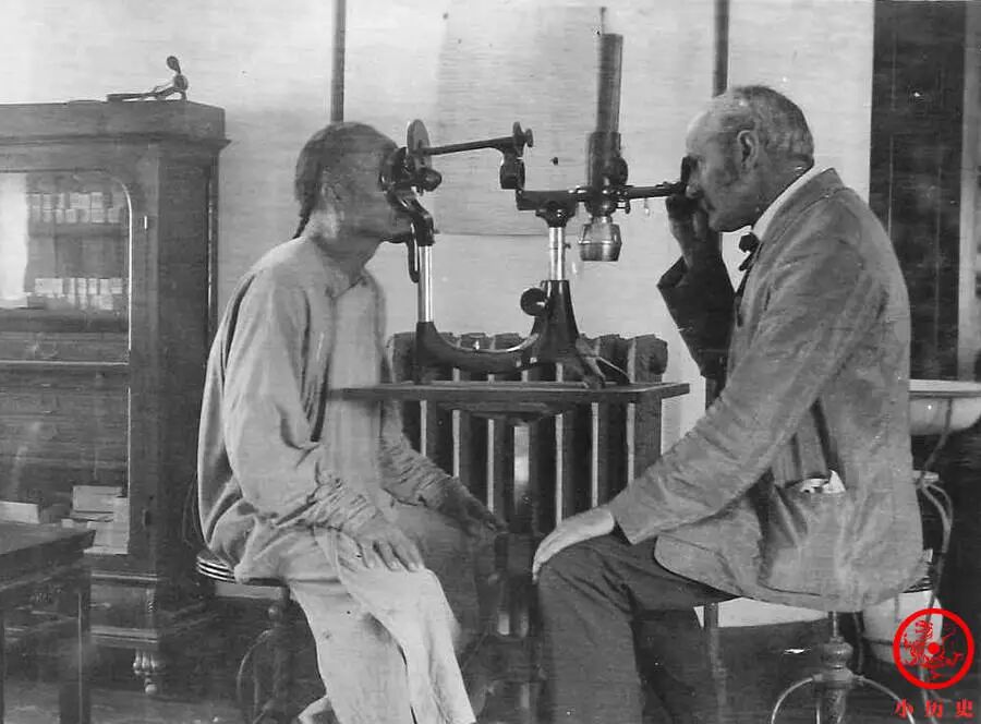 画面中,同仁医院一位外国医生正在使用先进仪器,为留着大辫子的中国男子检查眼睛。该院由美国医生蓝华德于1886年建立,以眼科为主。1899年,在霍普金斯家族的资助下扩建院区,引进了先进设备,极大促进了晚清医学事业的进步。