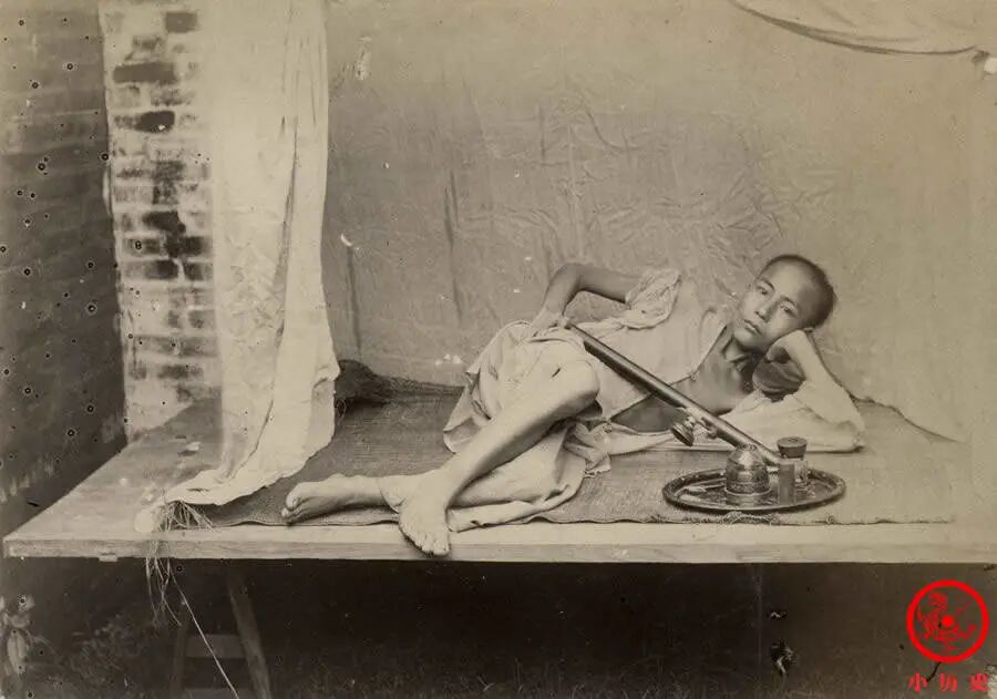 我们在中学历史课上学到过,鸦片深深毒害了晚清社会,加剧了积贫积弱的局面,这张照片就是一个活生生的例证。一个青年躺在木板床上,身边放着烟灯、烟枪等工具,眼神迷离,似乎刚刚过完瘾。据《慕雅德眼中的晚清中国》一书提供的数据,1880年代,清朝吸食鸦片的人数达到顶峰,在800万左右。