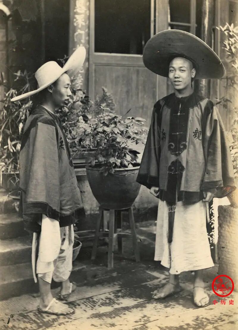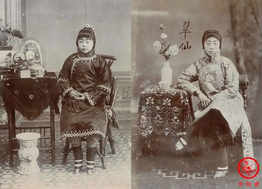 这两人都裹着“三寸金莲”,显示出传统的一面,事实上,她俩的刘海造型引领着当时的时尚潮流。大家现在司空见惯的刘海,是晚清时期先在青楼女子中流行开来,然后被良家女子模仿的。