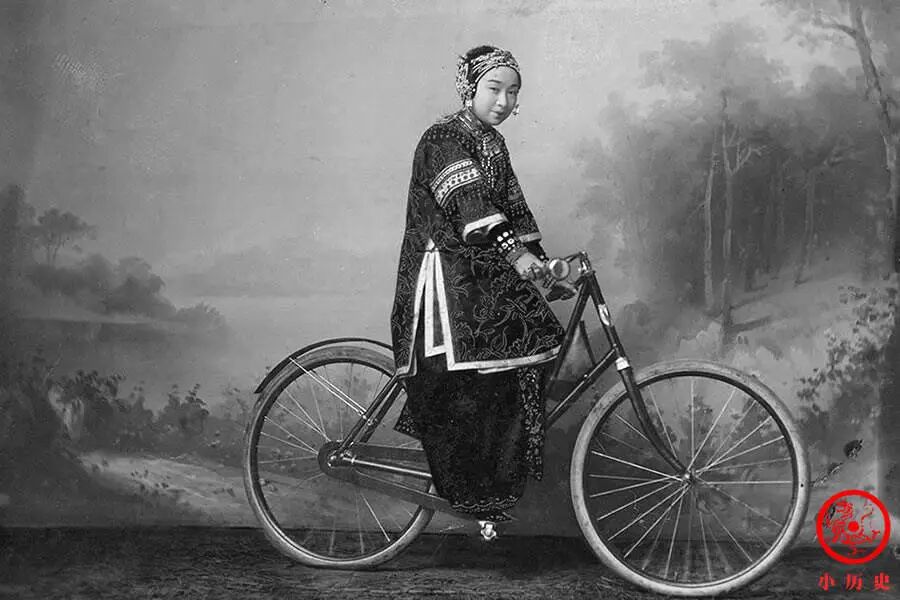 这张照片体现了时尚与古老传统的奇怪融合。自行车是晚清新鲜又奢侈的物品,普通人根本没有机会去体验;而画面中女子身上的抹额、袄裙、小脚,都有着悠久的历史,代表着传统守旧的一面。