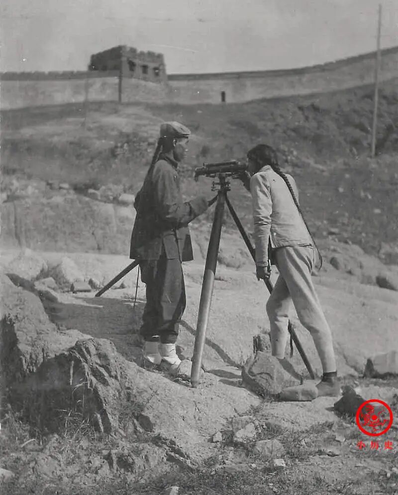 京张铁路是中国人自主设计、自行建造的首条铁路,詹天佑担任总设计师,1905年9月开工,1909年10月全线通车。照片中两位拖着大辫子的技术人员使用现代仪器,对线路途经之地进行测绘。