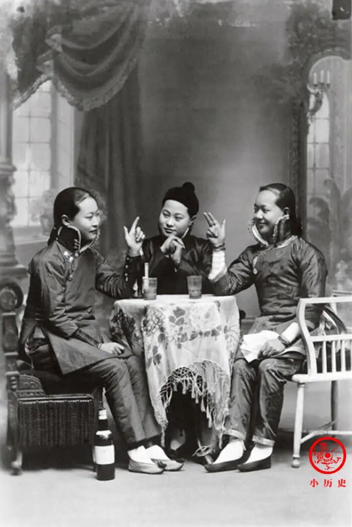 三位年轻女士喝酒猜拳,非常欢乐。她们的打扮非常时髦,袄裤不再是那种宽袍大袖的风格,而是更加修身,更能体现女性的身材曲线。