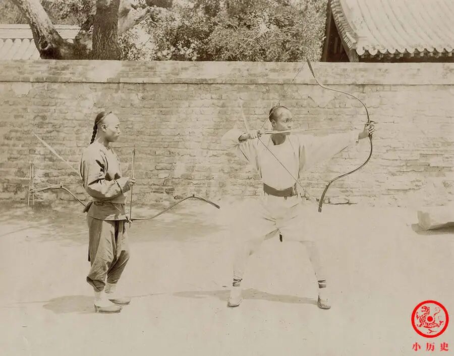 一个年轻人扎开马步,左手挽弓,右手搭箭,专心致志地瞄准目标,另外一人持箭待射,观察同伴的射箭结果。19世纪后半期,热兵器日益普及,而晚清的官学和武科举固执地坚守着骑射的传统,脱离实际、脱离时代。