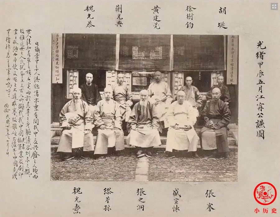 照片拍摄于1904年,张之洞到南京出差,与多位头面人物有了这张极为罕见的合影。当时张之洞任湖广总督,魏光焘任两江总督,盛宣怀任工部左侍郎,其他人也都身任重要官职。只有张謇挂三品官衔,没有实职,他正忙于创办工厂、学校等事业。
