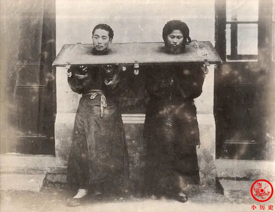 这张照片由英国摄影师威廉·桑德斯拍摄于上海,时间大约在1870年,画面中两个人是桑德斯聘请的模特,模拟戴枷示众的场景,其中右边那位还是兔唇。近期有多位自媒体作者把这张照片标注为“杨乃武与小白菜”,简直是胡扯。