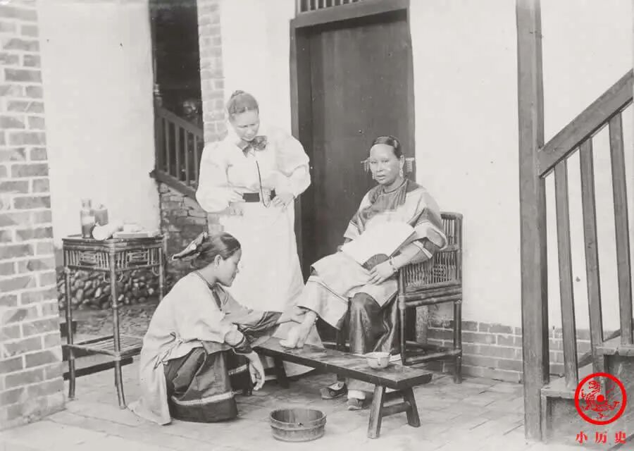 由于从小缠足,这位妇女的脚已经失去了原有的形状,她所承受的痛苦难以想象。而男人将她的痛苦美化为“三寸金莲”。