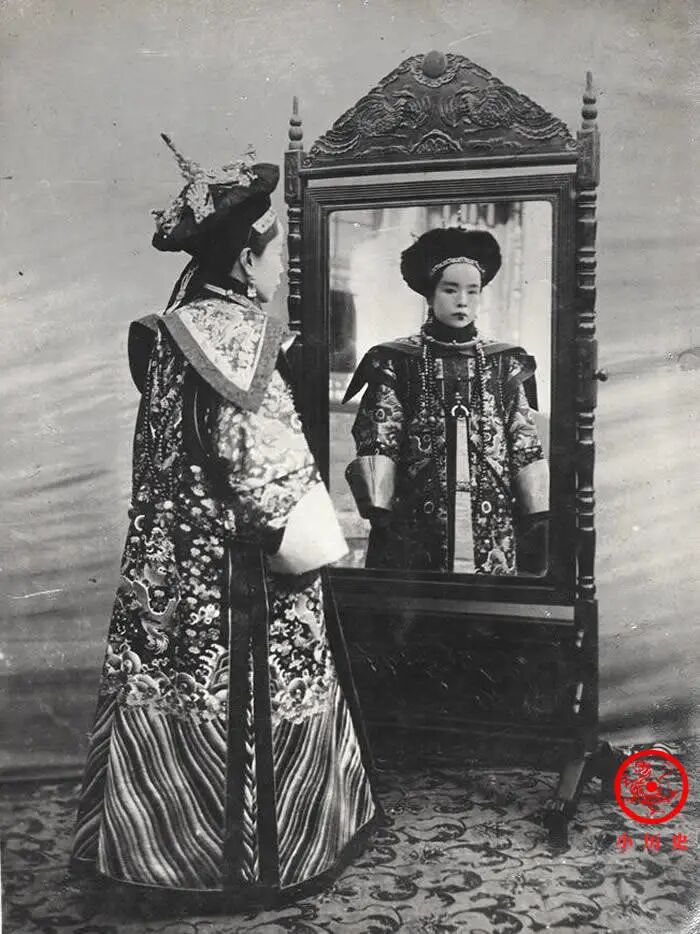 赫舍里氏站在镜子前拍照,既能看到正面,也能看到背面和侧面,最大程度地展示了自己的形象。她身穿蟒袍,雍容华贵,严肃庄重。