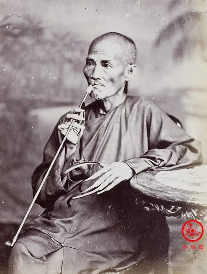 这位老人长长的手指甲特别引人关注。旧时不少男男女女都留很长的指甲,要说美观还真谈不上,其目的在于炫耀,那就是:我养尊处优,我不用劳动。另外,我看他的唇部细节,好像是“兔唇”。