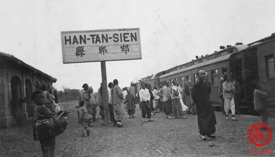 邯郸县火车站始建于1903年4月,1906年京汉铁路全线通车,火车站正式启用。它是清朝灭亡之前京汉铁路上的几个主要大站之一。根据照片所见,这座车站非常简陋,站台上连遮风挡雨的棚屋都没有,遇到雨雪天气候车,难免一片混乱。