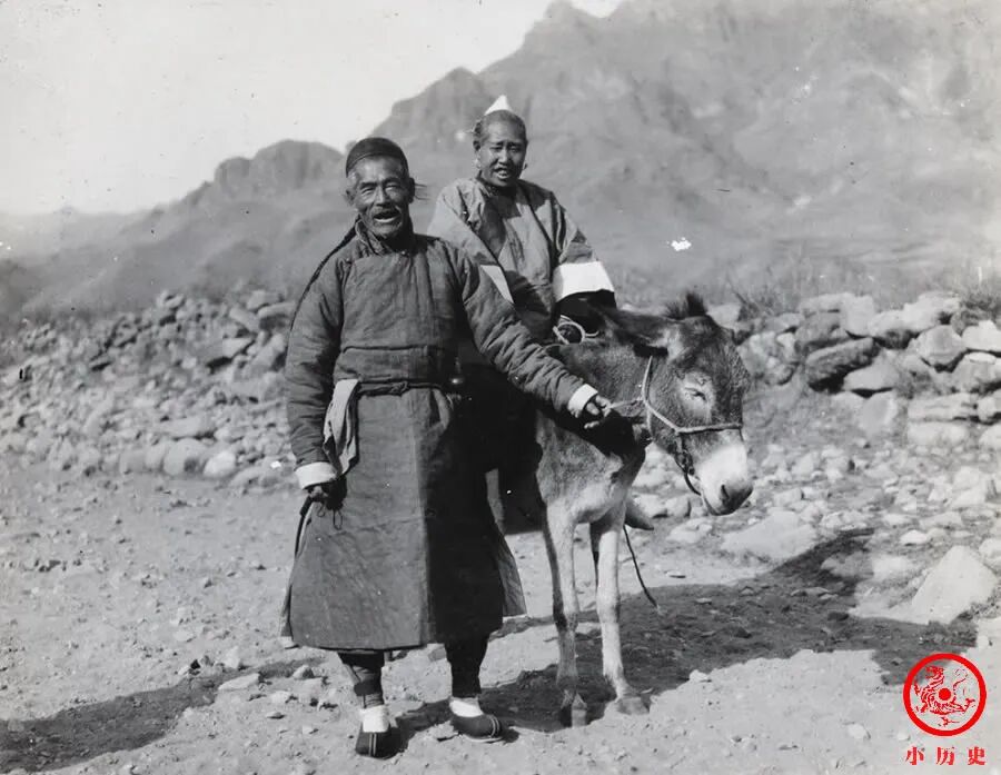 妻子骑着小毛驴,丈夫牵着,面对镜头轻松自然,真是一对快乐的夫妻。在生活条件很差的情况下夫妻二人能达到这种状态,确实不容易。