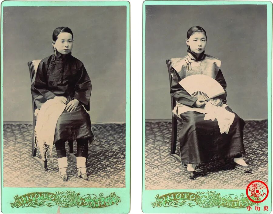 两位青楼女子年龄都不大,顶多十五六岁左右,一个着女装,一个着男装,一个小脚,一个天足,风格不同,但都面容姣好、清新秀丽。这类社会边缘人一般身世悲惨,从小被卖给青楼,经过训练之后或卖艺、或卖身。