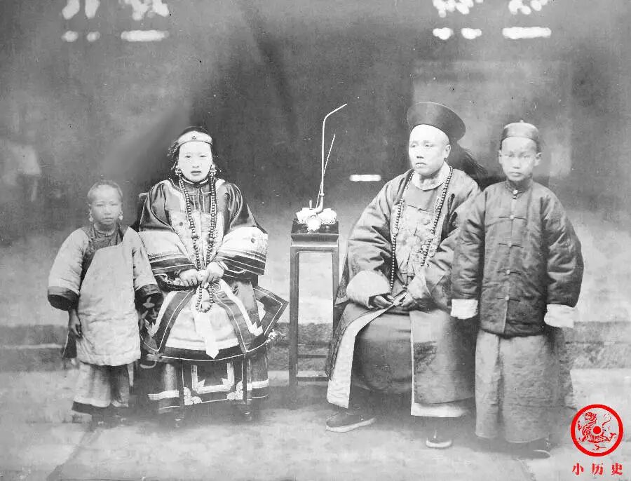 身为一家之主的男人是朝廷命官,身穿补服,项戴朝珠,显然他的品级不算低(文职五品、武职四品以上方可佩戴)。女主人也穿补服、戴朝珠,说明她已被朝廷封为“命妇”,享有很高的荣誉,很多男人一辈子努力的目标就是“封妻荫子”。如果这名官员立下功劳,他去世之后即便儿子没有获得科举功名,也会被授予一定的职衔。